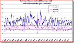 Here's a plot of annual rainfall in Perth over the last hundred years, since 1876. It shows that we are getting less rainfall than we did in the 1940s, and a bit more than we got at the beginning of last century. It certainly does not show any long- term decrease in rainfall. (Click on the plot to enlarge it.)